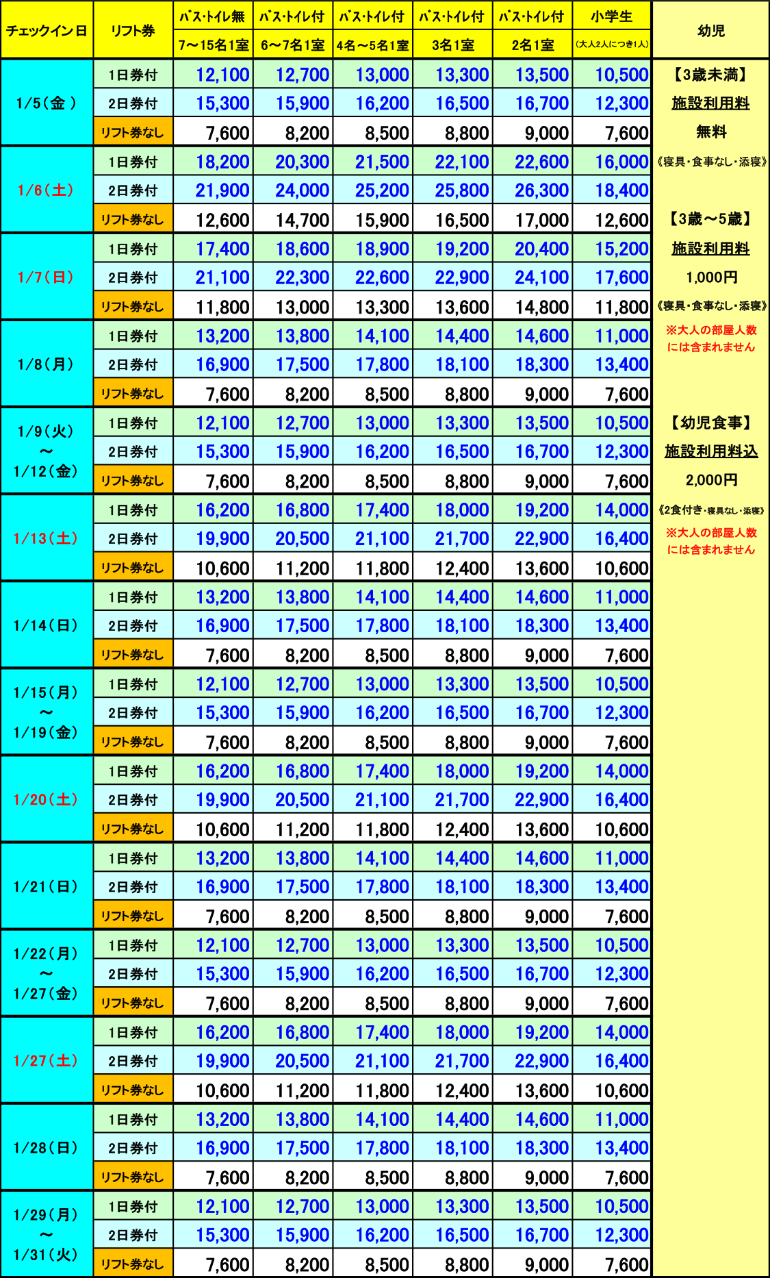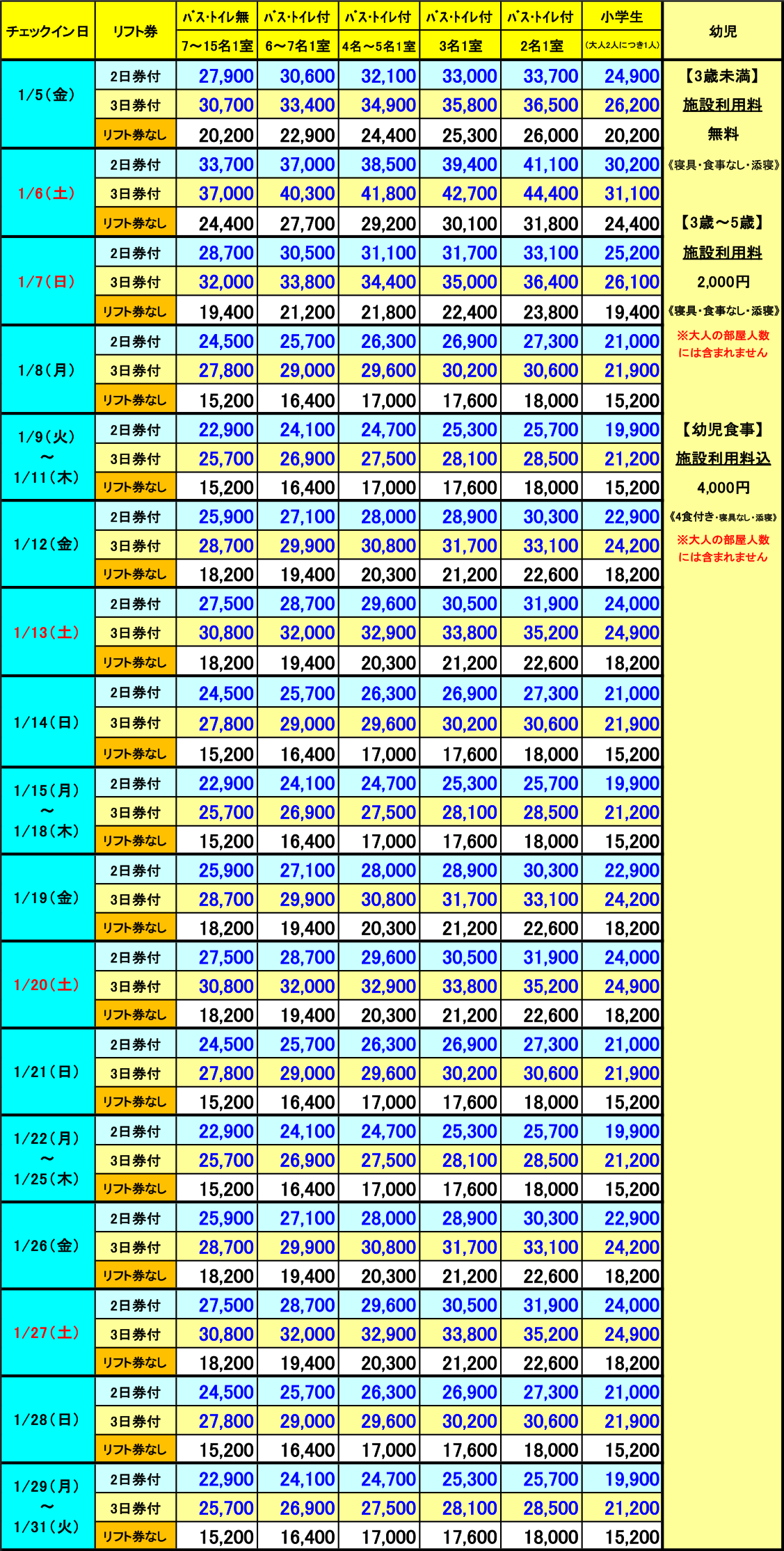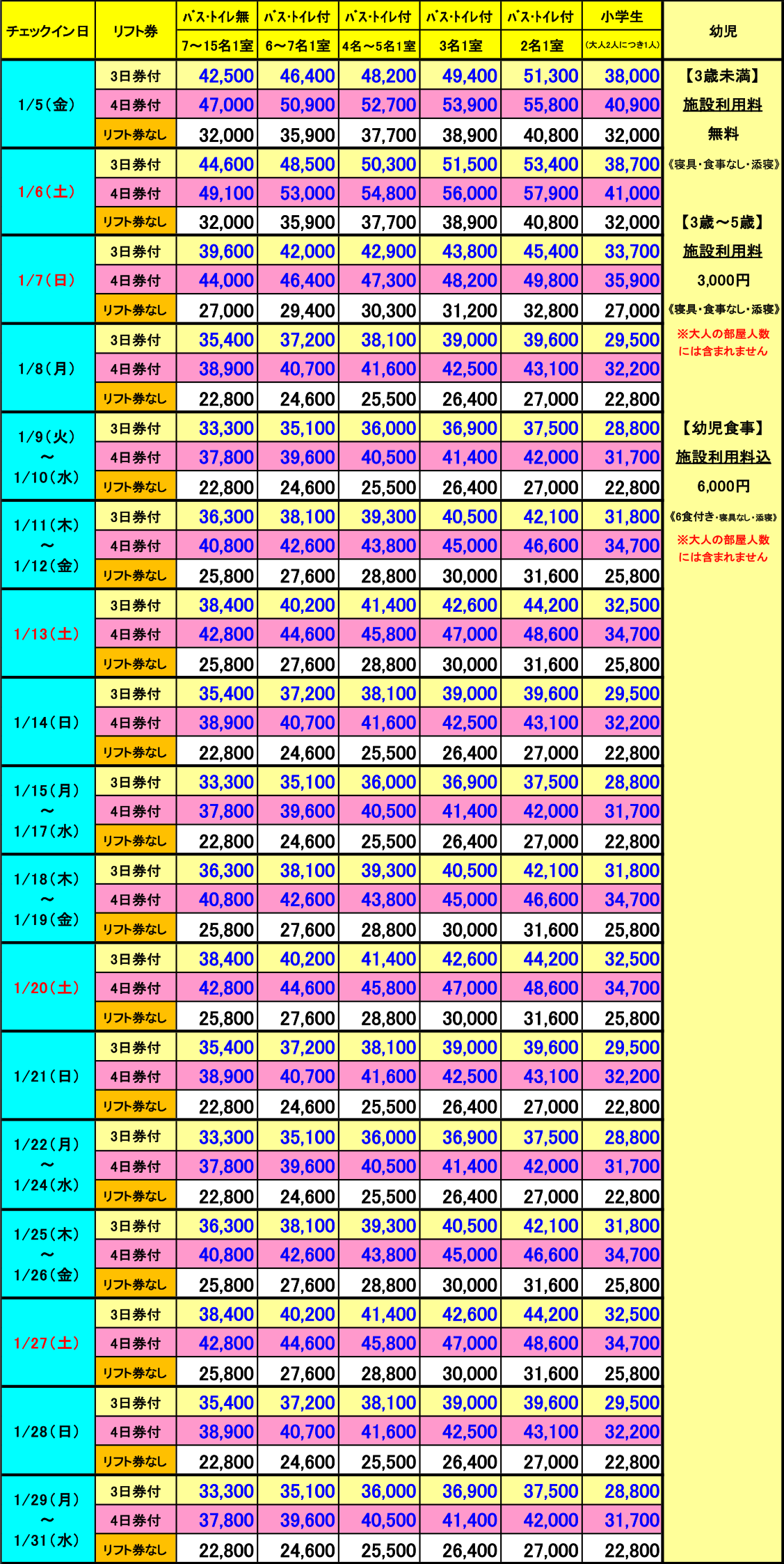 ▼1泊2日 1月格安リフト券パック宿泊代金(1泊2食付・消費税込/単位:円) ▼2泊3日 1月格安リフト券パック宿泊代金(2泊4食付・消費税込/単位:円) ▼3泊4日 1月格安リフト券パック宿泊代金(3泊6食付・消費税込/単位:円)