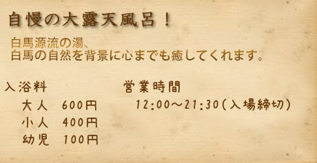 大露天風呂から見る白馬三山と田園風景は四季それぞれ異なり感動! 内湯は下呂温泉と同様の泉質、露天風呂乳白色の湯お肌をすっぽり包み込むようなしっとりタイプの湯です。 大露天風呂は入浴できる広いスペースお子様、お仲間同士と一緒になってゆっくりお入りください。
